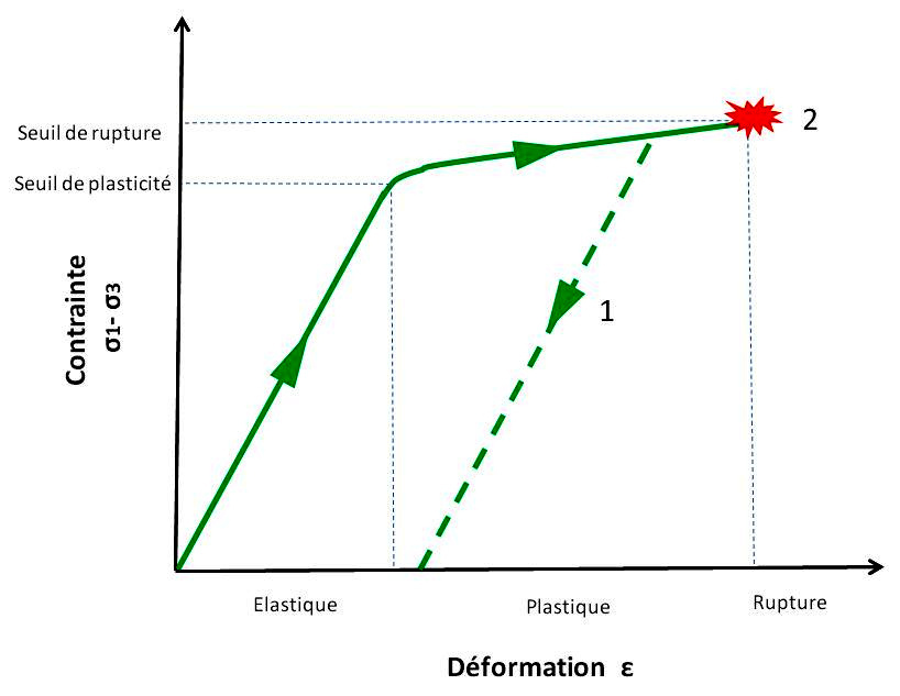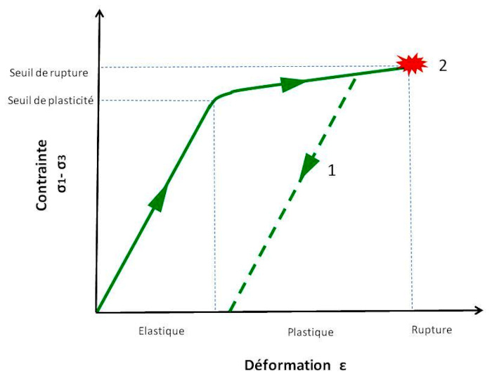 La figure suivante (figure 16) montre un diagramme contrainte-déformation. Dans le cas 1 (figure 13), les argiles sont déformées plastiquement, elles ne reviennent pas à leur état initial. Le seuil de plasticité a été atteint, elles gardent leur déformation (circuit en vert noté 1). Dans le cas 2 (figure 14), le seuil de rupture est atteint les argiles sont déchirées.