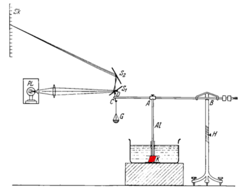 Esquisse schématique. Lampe spot en tungstène PL, miroir mobile S1, miroir fixe S2, échelle graduée Sk, axe D qui fait tourner le miroir, point de suspension C de la balance G, cristal Κ, encoche A, poinçon Al, tranchant Β, filetage Η pour le réglage de la hauteur.