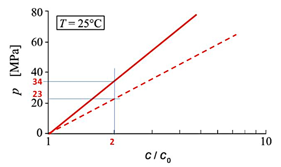 Le volume molaire du gypse est V = 74,3 cm3/mol. À l'équilibre, C/C0 = 1, la pression est donc nulle, puisque ln(1)=0. Pour C/C0 = 2, par exemple, on a alors P = (8,314×298/74,3.10−6).ln(2) ≈ 23,1 MPa, même si le calcul est ici plus qu'approximatif car on est loin de 1 pour C/C0, la valeur théorique étant de l'ordre de 34 MPa (figure 18).