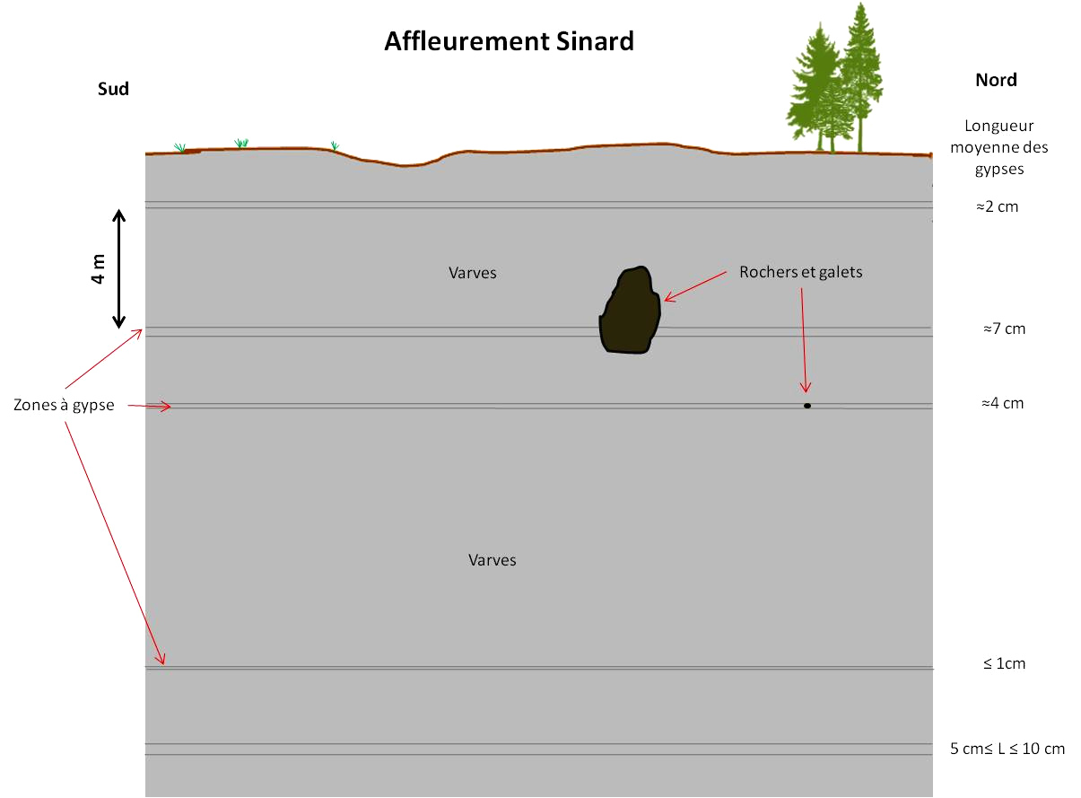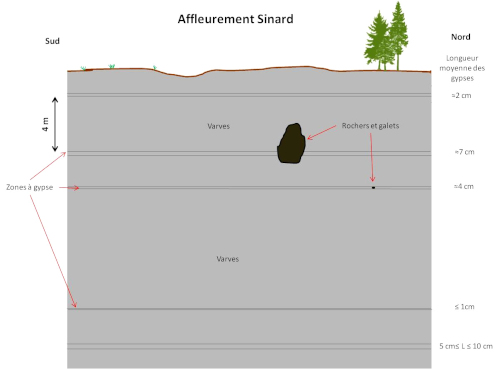 L'épaisseur des couches annuelles est variable en fonction des apports sédimentaires. Dans la zone du Trièves, elle est comprise entre 1 mm et 10 cm (Barailler, 2025[4]). À Sinard, l'épaisseur annuelle mesurée est d'environ 2 mm. Il suffirait donc de seulement 2 ou 3 ans pour faire un premier germe de gypse (… dans les conditions stœchiométriques “idéales”).