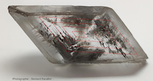 Cristal de dimensions 5,5 × 2 × 1,5 cm. Les “stries” d'argiles marquant les étapes de croissance sont surlignées en tiretés rouges.