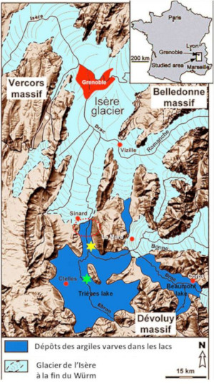 Les cristaux de gypse du Trièves sont enchâssés dans des argiles lacustres datant du Würm, l'une des périodes glaciaires pléistocènes des Alpes (cf. Thomas, 2021[30]). À cette époque, Sinard est au front Sud du glacier de l'Isère (Grenoble est sous les glaces) qui débouche sur le lac du Trièves (figure 4, Jongmans et al., 2009[14]). L'érosion des piémonts du Vercors et du Dévoluy apportent cycliquement des sédiments et notamment des argiles qui se déposent au fond du lac.