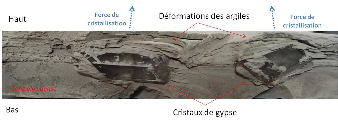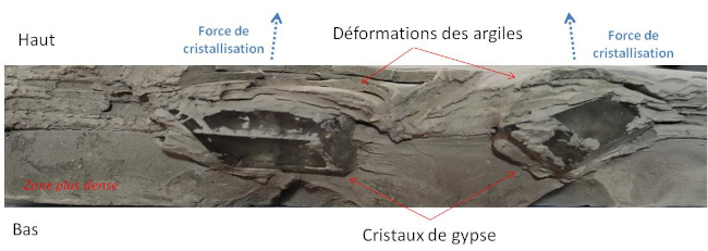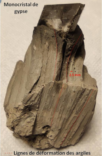 L'observation de gypses (pluri)centimétriques, montre que les argiles qui sont au-dessus des cristaux ont subi une déformation plastique (figure 5). Les niveaux d'argiles sur lesquels sont “posés” les gypses sont moins déformés par la croissance des cristaux que les niveaux qui les recouvrent, certains, par endroits, étant même clairement “déchirés” par les gypses les plus gros (Barailler 2025[4]).