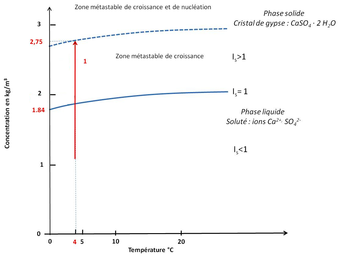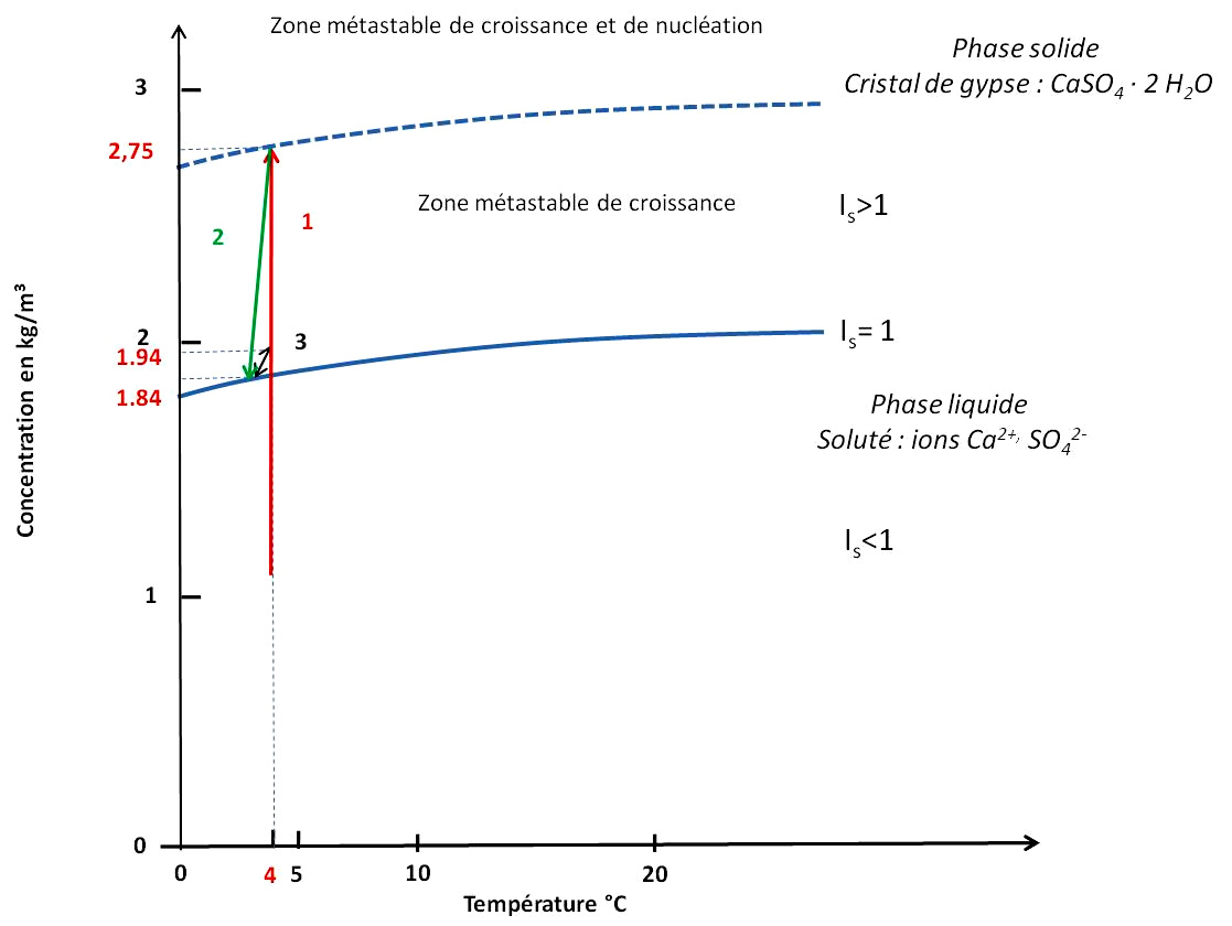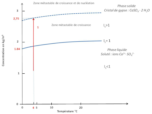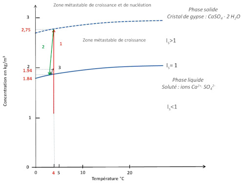 Pour des raisons de lisibilité, une légère baisse de température (2) et une sursaturation (3) de 0,1 g/L sont considérées. Le produit d'activité est représenté en équivalent solubilité du gypse en g/L.
