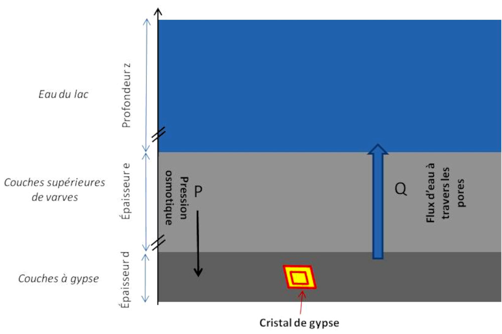 On se propose de modéliser la concentration de la solution présente dans la porosité des varves en considérant que les argiles se comportent comme une membrane semi-perméable entre la solution comprise dans une couche d’argile et l'eau du lac. La différence de concentration solution / lac (considéré comme un réservoir “constant”) crée une pression osmotique maintenue ou augmentée par la pression due au poids des sédiments sus-jacents.
