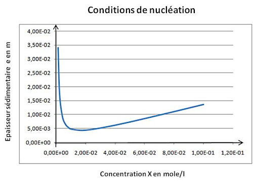 On voit qu'épaisseur de sédiments et concentration de la solution sont proportionnelles. L'épaisseur minimale compensant la pression osmotique correspond donc à la concentration minimale en solution à saturation ou au seuil de solubilité. On peut rapidement montrer que la concentration totale de la solution est minimale lorsque X = Y = √KS (ou √KN, selon qu'on s'intéresse à la saturation ou à la nucléation spontanée), avec, de fait, C = 2.X (Dequincey, 2025[8]). À 4°C, les valeurs de solubilité de la figure 6 correspondent à des concentrations en solution CSat = 21,4.10−3 mol/L [KS = 1,15.10−4 et X = 1,07.10−2] ou CNuc =32,0.10−3 mol/L [KN = 2,56.10−4 et X = 1,6.10−2].