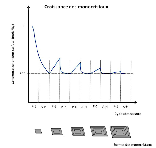 Durant la période printemps-été (PE), un apport de sédiments grossiers est fourni. La pression sédimentaire augmente alors. La température peut aussi légèrement baisser par un apport d'eau plus froide. Lorsque la pression sédimentaire augmente, l'eau de la solution mère résiduelle emprisonnée dans la couche où baignent les cristaux sort par les pores, ce qui entraine une augmentation des concentrations en ions sulfate et calcium. La croissance cristalline peut reprendre dans la zone métastable jusqu'à retour à l'équilibre cristal-solution. Durant la période automne-hiver (AH) le lac est gelé, l'apport sédimentaire est limité au fond du lac, la croissance s'arrête et des particules fines se déposent, formant les fantômes de croissance.