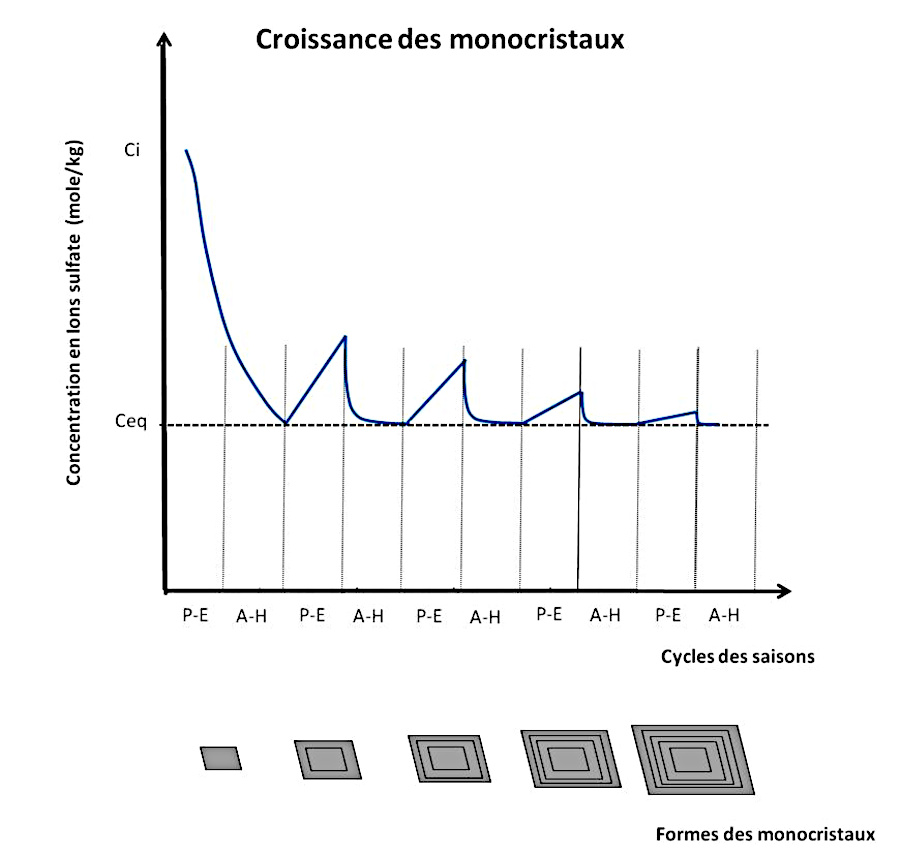 Arrivé à l'équilibre, la croissance est interrompue. Au niveau microscopique, des dépôts de particules fines peuvent se produire sur les faces et les anfractuosités du cristal, formant des ombres de croissance. Pour que la croissance reprenne, une sursaturation est nécessaire. Comme le dépôt d'argiles est très faible en hiver, aucune évolution notable des concentrations n'est à envisager au sein des sédiments. Par contre, les dépôts sont plus importants pendant la période printemps-été. Chaque dépôt annuel, principalement en printemps-été, induit une augmentation de pression sédimentaire et donc une légère compaction, d'où une augmentation de concentration de la solution dans les varves affectées par osmose inverse (chemin 3, en noir, vers le haut). La croissance peut alors reprendre jusqu'à retour à l'équilibre (chemin 3, en noir, vers le bas). Ceci amène à une croissance “cyclique” liée aux dépôts annuels de varves. La concentration oscille alors entre la valeur d'équilibre/saturation et une sursaturation liée aux dépôts de l'année (chemin 3, en noir). La croissance cristalline s'arrête définitivement dès que la sursaturation n'est plus possible par arrêt de la compaction. On ne peut pas parler de possible épuisement de l'un des réactifs. En effet, la “consommation” de calcium peut être compensée par la dissolution de calcaire et la présence d'ions sulfate résiduels est certaine puisque sinon cela entrainerait la dissolution de gypse jusqu'à retour à l'équilibre (et donc à la présence de calcium et de sulfates dans la solution). Cependant, dans le contexte géologique du Trièves, on peut parler des ions sulfate comme facteur “limitant” (par rapport au calcium “abondant”).