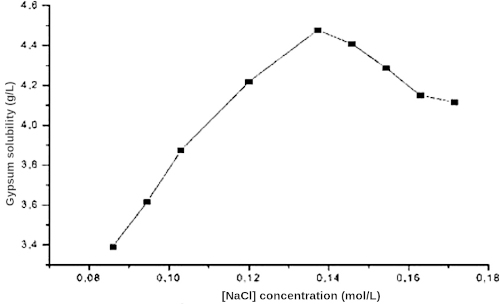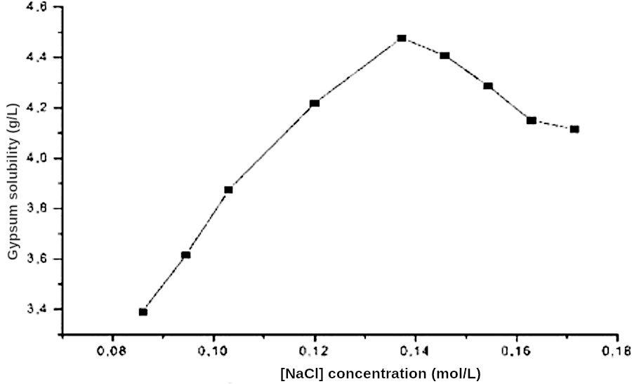Un apport en sel augmente la solubilité du gypse et donc retarde d'autant sa cristallisation (figure 13). De plus, la cristallisation du gypse dans des solutions de chlorure de sodium a été étudiée en présence d'ions magnésium. Les ions Mg2+ ont un effet inhibiteur sur les deux étapes de précipitation : la nucléation et la croissance du gypse.