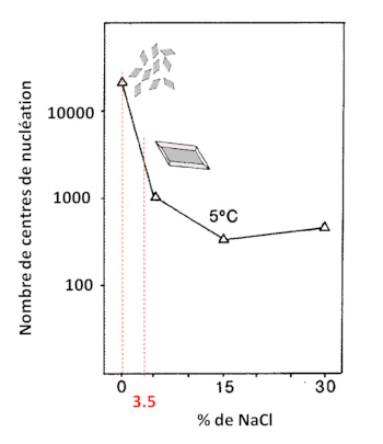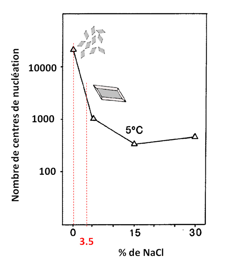 On observe, par exemple, que le passage d'une salinité nulle à celle de la mer (3,5 %) divise par 10 le nombre de centres de nucléation. Au maximum, la différence de salinité induit un rapport de 82. Ces centres de nucléation sont en compétition pour capter les unités de croissance présentes dans la solution. En première approche, la taille des cristaux est donc inversement proportionnelle à la densité de nucléation. Les résultats montrent que des cristaux de gypse beaucoup plus gros sont obtenus en présence de NaCl ajouté.