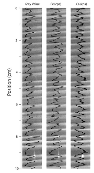 Dans le cas de la figure précédente, les varves sont caractérisées par des sous-lames printanières sombres et liées au ruissellement, qui sont riches en éléments allochtones notamment en Ca, tandis que les sous-lames pâles de l'été à l'automne sont enrichies en Fe. Les variations interannuelles sont très faibles (les mêmes variations saisonnières se répètent d'année en année). Les variations saisonnières étant bien conservées, on peut s'attendre à ce que les variations interannuelles soient elles aussi préservées et donc que de possibles enrichissements épisodiques en sodium et/ou en sulfate restent cantonnés dans les couches de varves correspondantes.