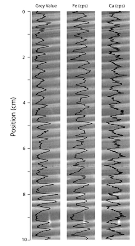 On observe des couplets annuels clairs / sombres avec des niveaux clairs (estivaux) plus riches en fer que les niveaux sombres (printaniers) et l'inverse pour le calcium.