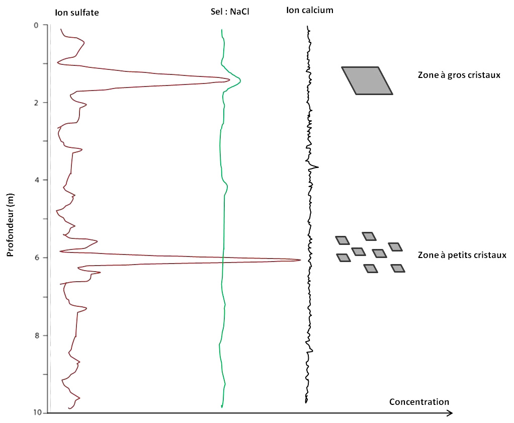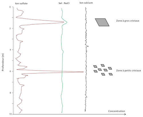 Les ions sulfate sont ici le facteur limitant. Leur absence ou leur faible teneur ne permet pas d'avoir de gypse, on a alors des couches stériles en gypse. Leur présence, en quantité “juste suffisante” ou en grande quantité, permet la sursaturation et la formation de gypses dont la taille pourrait dépendre d'autres facteurs tels que la teneur en ions sodium, dont la forte teneur favorise l'apparition d'un nombre réduit de cristaux potentiellement plus gros. Une faible teneur en sel augmente le nombre de germes et provoque la création de nombreux cristaux plus petits. Enfin, les ions Mg2+, non représentés sur la figure 16, sont aussi des inhibiteurs de genèse du gypse.