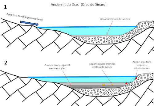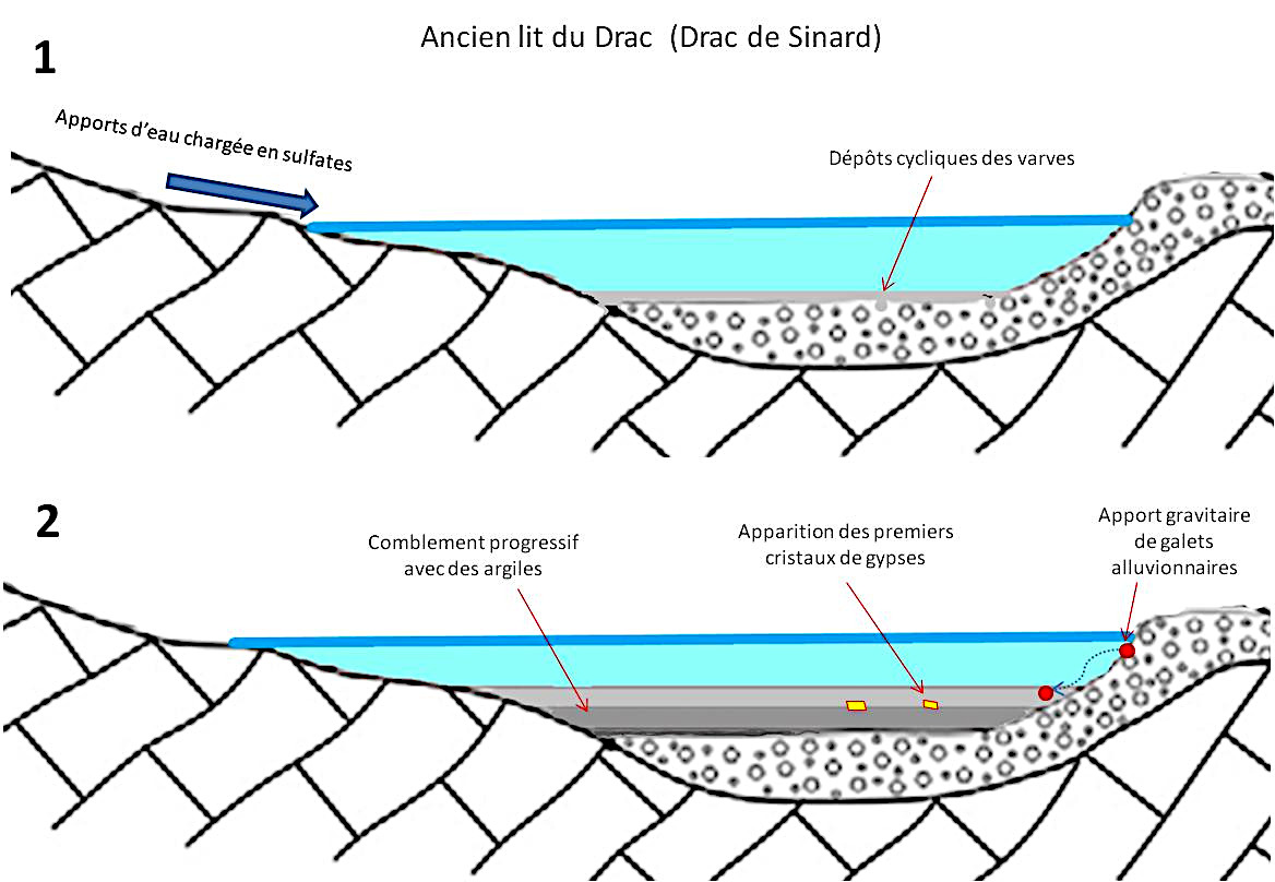 (1) À l'époque du Würm, un lac glaciaire se forme. Il est gelé l'hiver. Ceci amène un apport cyclique de sédiments qui vont former des varves. Par ailleurs les rivières apportent épisodiquement des ions sulfate issus de l'oxydation des sulfures des bassins versants et du lit des cours d'eau alimentant le lac (altération de l'Aalénien à nodules pyriteux).