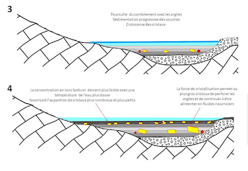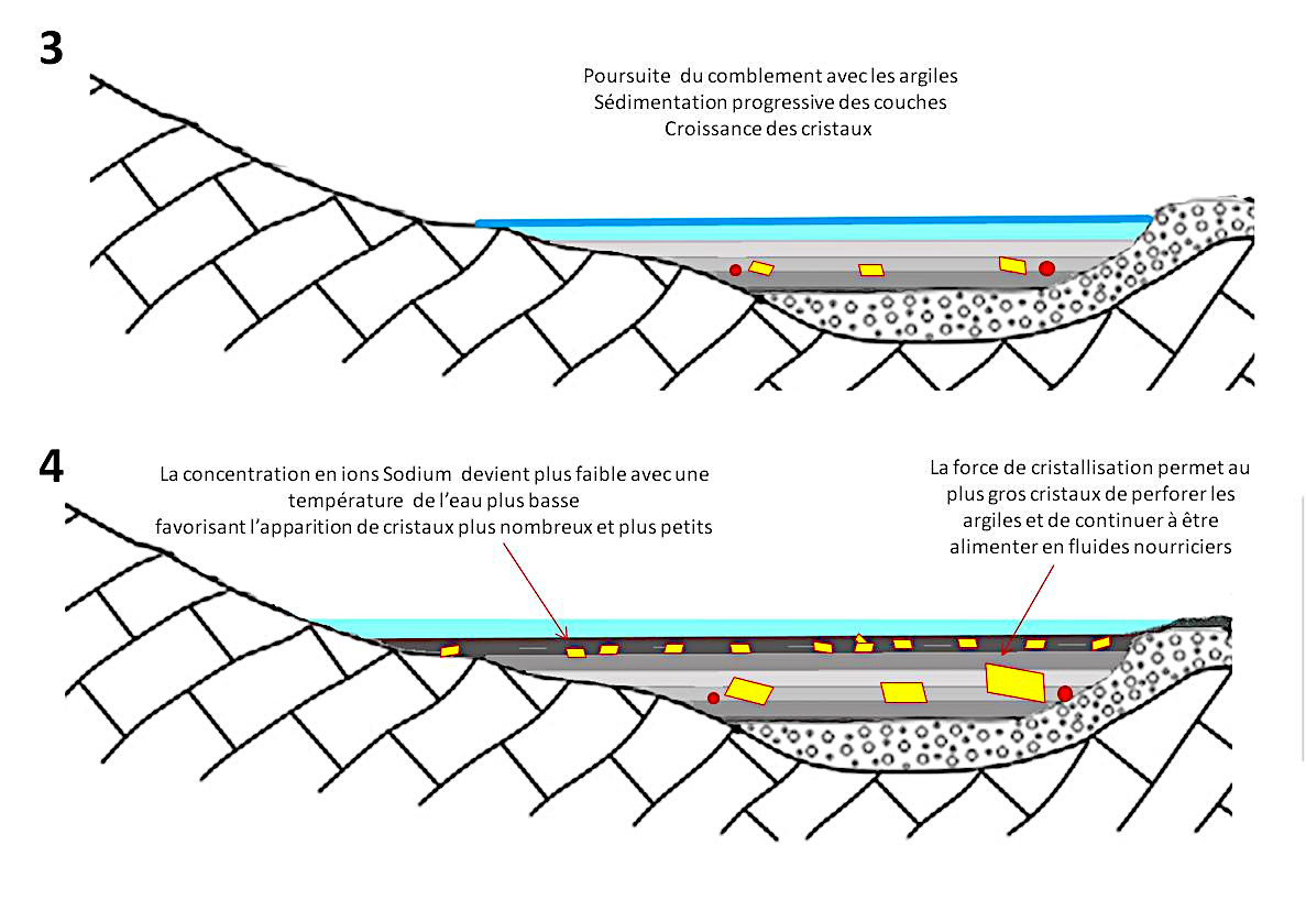 (3) La sédimentation se poursuit, des cristaux de gypse croissent en déformant les argiles par la force de cristallisation et atteignent leur taille définitive en quelques années. Parfois les conditions de cristallisation des gypses ne sont pas réunies (quantité insuffisante d'ions sulfate, présence d'ions inhibiteurs comme le magnésium…), les couches d'argile correspondantes ne présentent alors pas de cristaux visibles, du moins pas visibles à l'œil nu.