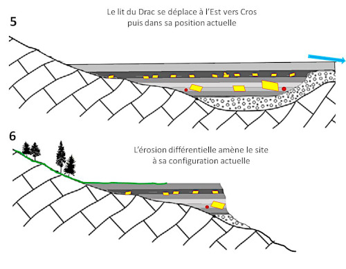 (5) Le lit du Drac évolue et se déplace vers l'Est. La zone s'assèche. la croissance des cristaux est à priori interrompue.