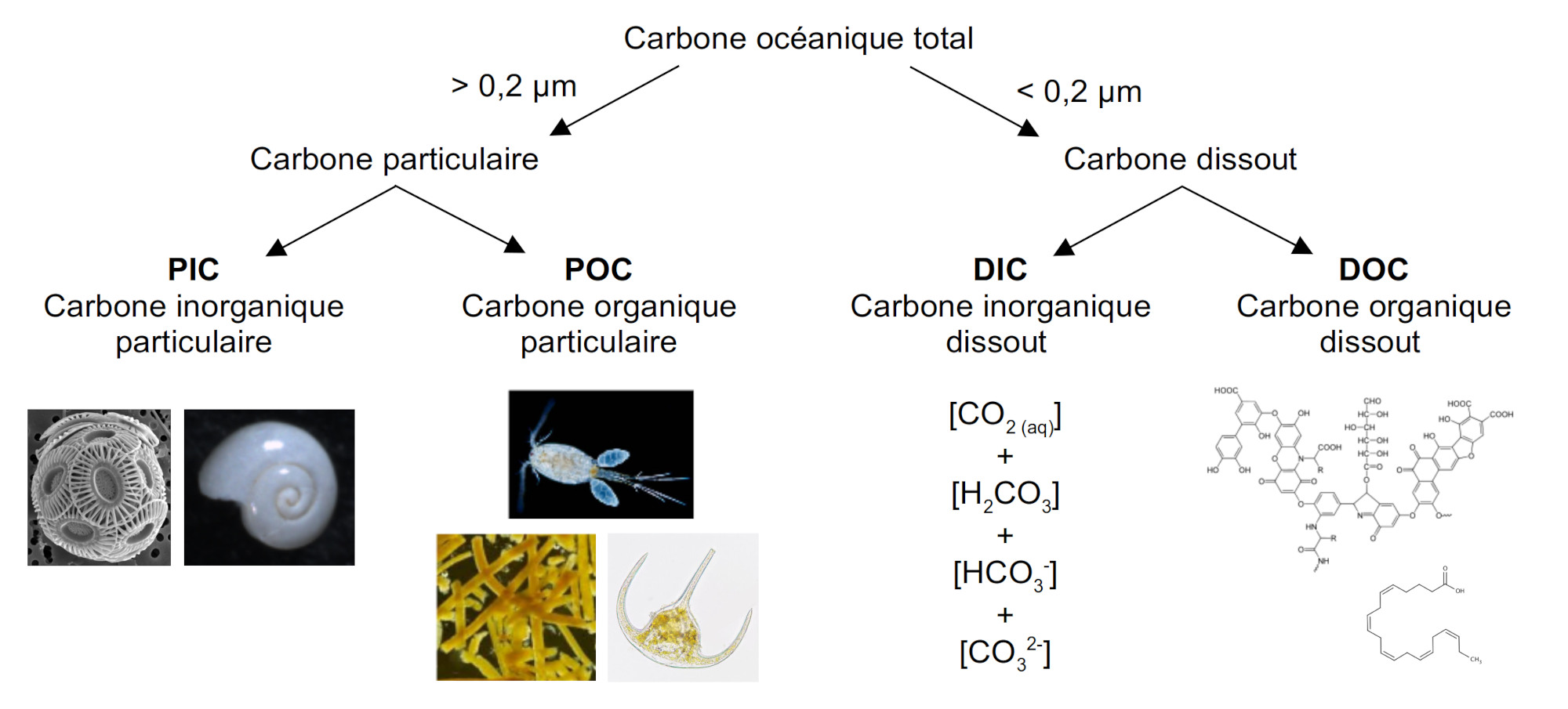 Le carbone se trouve dans l'océan sous différentes formes que les océanographes biogéochimistes ont classé selon des critères pratiques : le dissout, le particulaire, l'organique, et l'inorganique (figure 1). Le carbone dissout correspond à la fraction qui passe à travers un filtre de porosité 0,2 µm (ou 0,7 µm selon les auteurs). Le carbone particulaire est donc la fraction qui reste sur le filtre. Le carbone organique est la fraction qui ne se dissout pas dans l'acide chlorhydrique. Le carbone inorganique est calculé comme la différence entre le carbone total et la fraction résiduelle non dissoute. Ces critères définissent quatre compartiments : le carbone organique particulaire (POC), le carbone inorganique particulaire (PIC), le carbone organique dissout (DOC), et le carbone inorganique dissout (DIC).