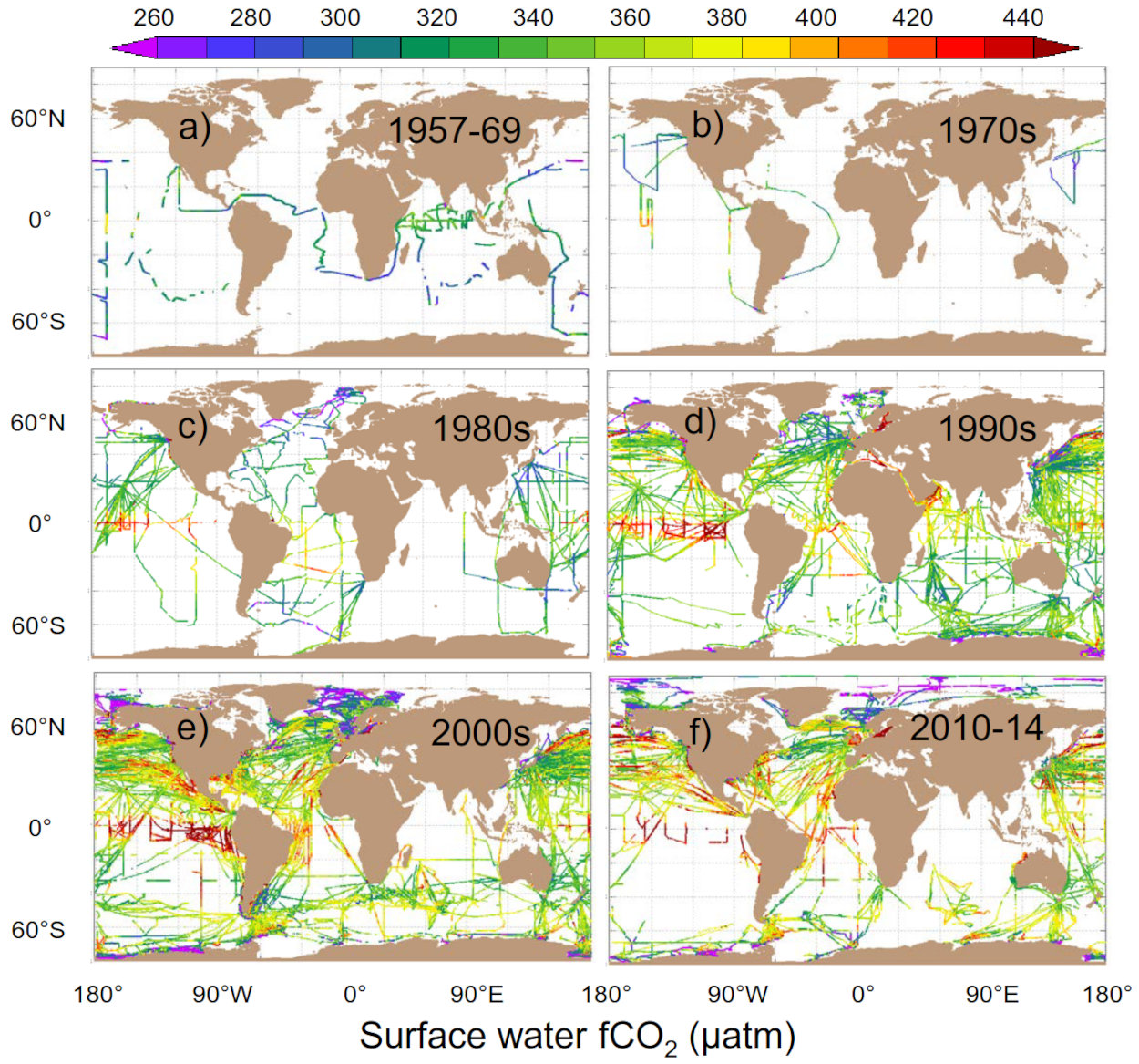 - D.C.E. Bakker, B. Pfeil, C.S. Landa, N. Metzl, K.M. O'Brien, A. Olsen, K. Smith, C. Cosca, S. Harasawa, S.D. Jones, S. Nakaoka, Y. Nojiri, U. Schuster, T. Steinhoff, C. Sweeney, T. Takahashi, B. Tilbrook, C. Wada, R. Wanninkhof, S.R. Alin, C.F. Balestrini, L. Barbero, N.R. Bates, A.A. Bianchi, F. Bonou, J. Boutin, Y. Bozec, E.F. Burger, W.-J. Cai, R.D. Castle, L. Chen, M. Chierici, K. Currie, W. Evans, C. Featherstone, R.A. Feely, A. Fransson, C. Goyet, N. Greenwood, L. Gregor, S. Hankin, N.J. Hardman-Mountford, J. Harlay, J. Hauck, M. Hoppema, M.P. Humphreys, C.W. Hunt, B. Huss, J.S.P. Ibánhez, T. Johannessen, R. Keeling, V. Kitidis, A. Körtzinger, A. Kozyr, E. Krasakopoulou, A. Kuwata, P. Landschützer, S.K. Lauvset, N. Lefèvre, C. Lo Monaco, A. Manke, J.T. Mathis, L. Merlivat, F.J. Millero, P.M.S. Monteiro, D.R. Munro, A. Murata, T. Newberger, A.M. Omar, T. Ono, K. Paterson, D. Pearce, D. Pierrot, L.L. Robbins, S. Saito, J. Salisbury, R. Schlitzer, B. Schneider, R. Schweitzer, R. Sieger, I. Skjelvan, K.F. Sullivan, S.C. Sutherland, A.J. Sutton, K. Tadokoro, M. Telszewski, M. Tuma, S.M.A.C. van Heuven, D. Vandemark, B. Ward, A.J. Watson, S. Xu, 2016. A multi-decade record of high-quality fCO2 data in version 3 of the Surface Ocean CO2 Atlas (SOCAT)(lien externe - nouvelle fenêtre), Earth System Science Data, 8, 383–413 [CC BY 4.0]
