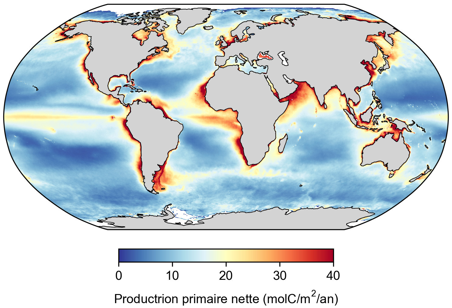 Résultat d'un modèle de production primaire appliqué aux données satellitaires de couleur de l'eau. Le centre des gyres océaniques est peu productif car le phytoplancton y est limité par la faible concentration en nutriments. Les zones les plus productives correspondent à un enrichissement en nutriments par les courants ascendants (upwellings côtiers ou équatoriaux) ou par l'apport des fleuves côtiers.