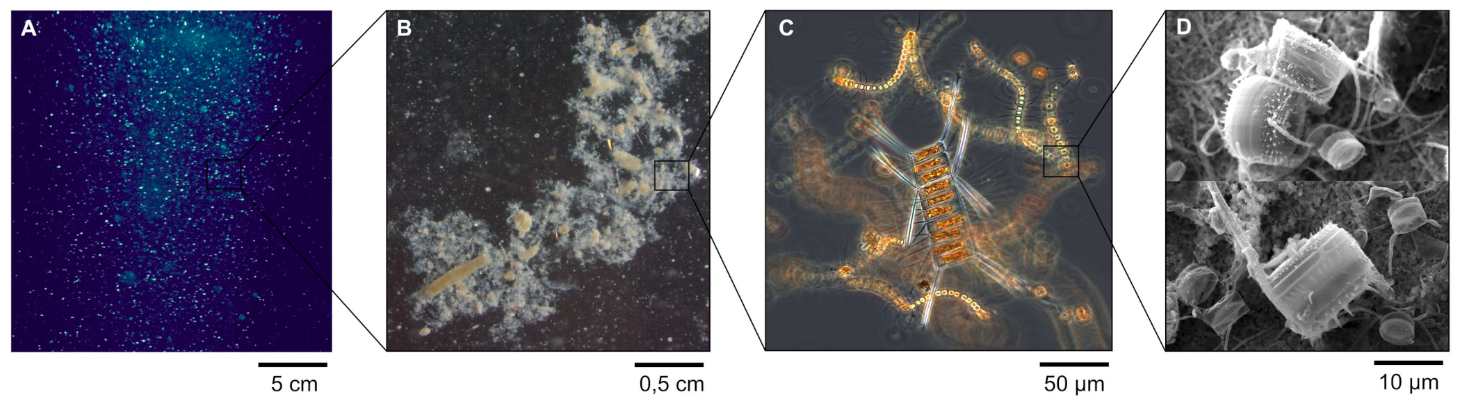 B. Observation à la loupe binoculaire. On distingue des pelotes fécales de zooplancton de forme ovoïde ou cylindrique prises dans un agrégat blanchâtre de phytoplancton.