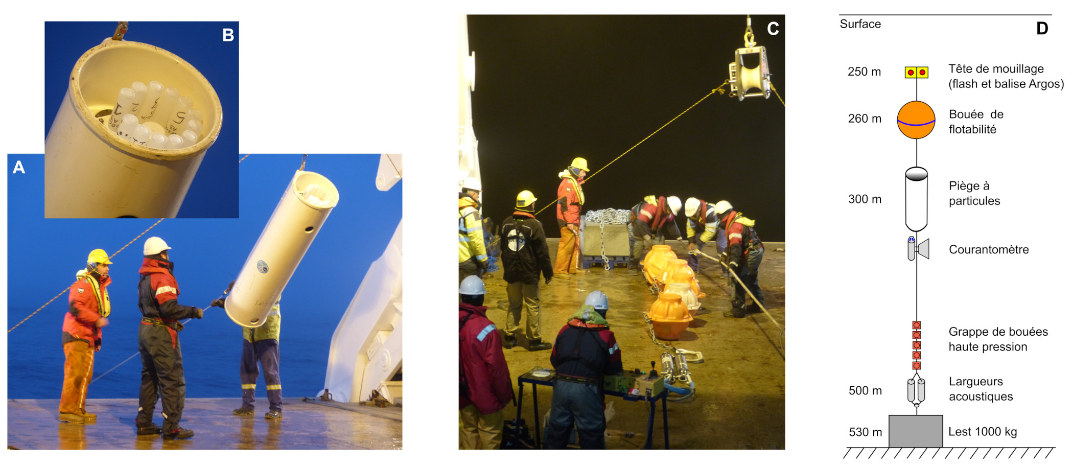 D. Schéma de la ligne de mouillage déployée sur le plateau des iles Kerguelen en 2016 lors de la campagne SOCLIM.