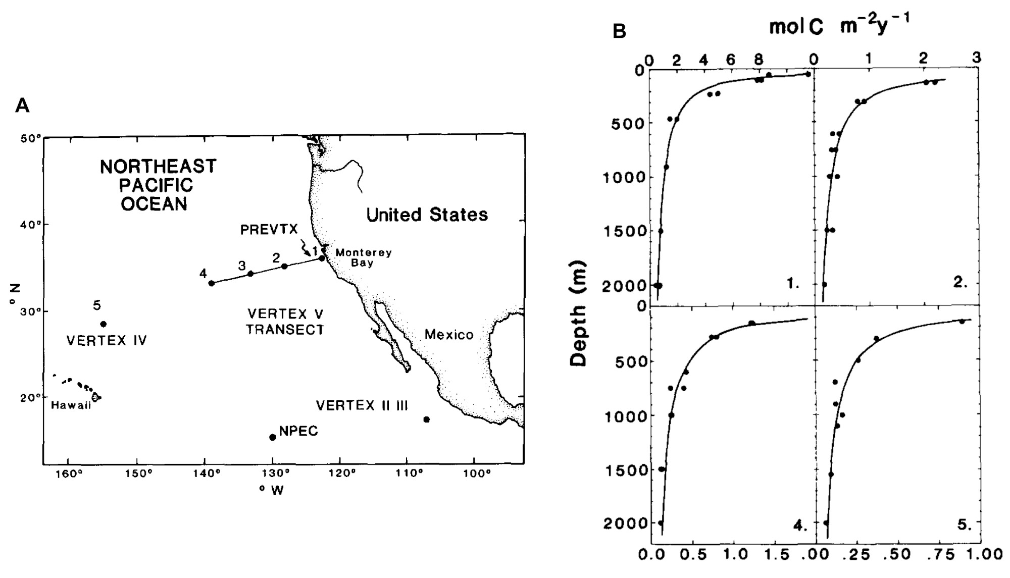 Les premiers déploiements massifs de pièges à particules réalisés par l'équipe du chercheur américain John Martin dans le Pacifique Nord à la fin du XXe siècle ont mis en évidence une décroissance du flux de POC avec la profondeur (figure 11 ; Martin et al., 1987[14]). Elle est causée par la consommation des particules organiques au cours de leur chute par les organismes hétérotrophes (bactéries et zooplancton), qui les reminéralisent en CO2. Martin formalisera cette décroissance par une équation qui porte son nom :