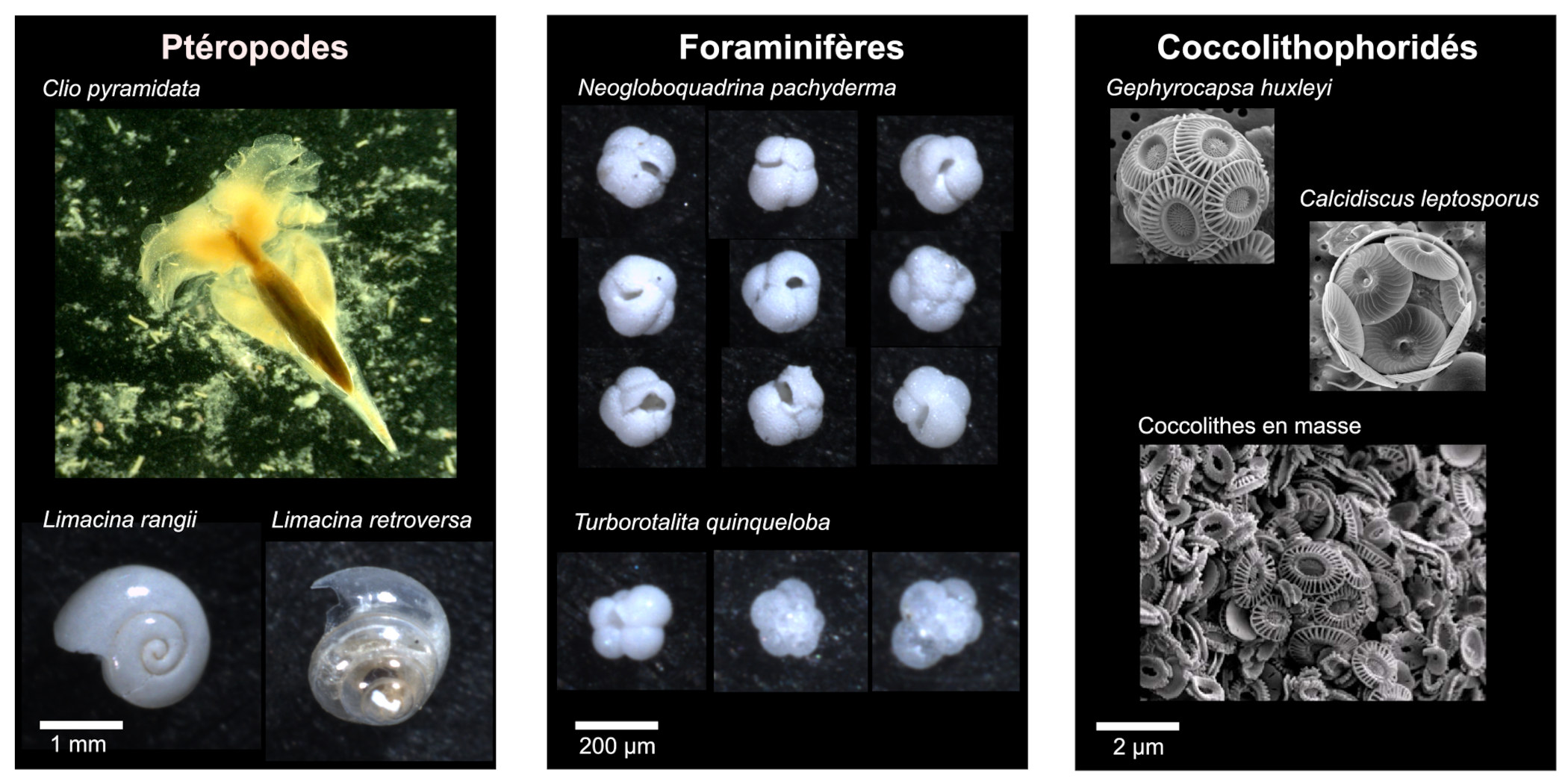 Les ptéropodes sont des mollusques qui fabriquent une coquille en aragonite. Les foraminifères sont des unicellulaires appartenant aux Rhizaires dont le test en calcite est constitué de loges successives terminées par une ouverture ombilicale. Les coccolithophoridés sont des unicellulaires appartenant aux Haptophytes qui fabriquent des écailles en calcite, les coccolithes, qui entourent la cellule en formant une coccosphère.