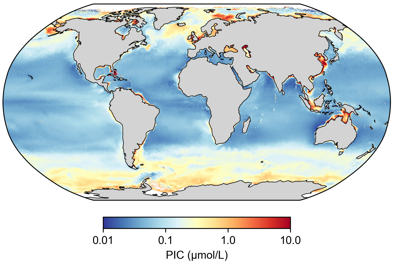 Les fortes concentrations aux hautes latitudes, ou « ceintures de calcite », reflètent la présence de coccolithophoridés dans les eaux froides. Les fortes concentrations en zone côtière peuvent être dues à l'apport de PIC détritique terrigène par les fleuves.