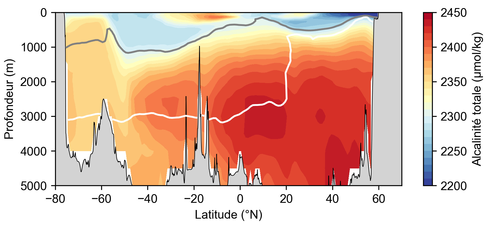 La profondeur de compensation des carbonates (Ω = 1) est représentée par une courbe grise pour l'aragonite et blanche pour la calcite. En surface, la bio-précipitation des carbonates consomme des ions hydrogénocarbonate (HCO3-) et la solubilisation du CO2 aboutit à une augmentation de la concentration en H+. Ces deux mécanismes contribuent à diminuer l’alcalinité totale. Les eaux denses qui plongent aux hautes latitudes depuis la surface et atteignent 1 000 mètres de profondeur possèdent donc une faible alcalinité. Sous la profondeur de compensation des carbonates, la dissolution du carbone inorganique particulaire (PIC) qui coule depuis la surface produit des ions HCO3− qui augmentent l'alcalinité.