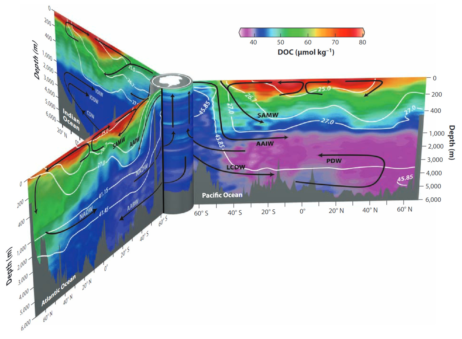 Le DOC est produit par exsudation du phytoplancton et excrétion du zooplancton en surface. Il est ensuite consommé et reminéralisé par les bactéries dans l'océan profond tout au long de son transport par la circulation thermohaline. Les faibles concentrations localisées à plus de 1 000 mètres de profondeur dans le Pacifique (couleur violette) sont essentiellement constituées de DOC réfractaire résiduel au temps de demi-vie dépassant le millier d'années. Ce stock de carbone organique peu consommable, et donc peu reminéralisable, séquestre à long terme le carbone dans l'océan et limite son retour dans l'atmosphère.
