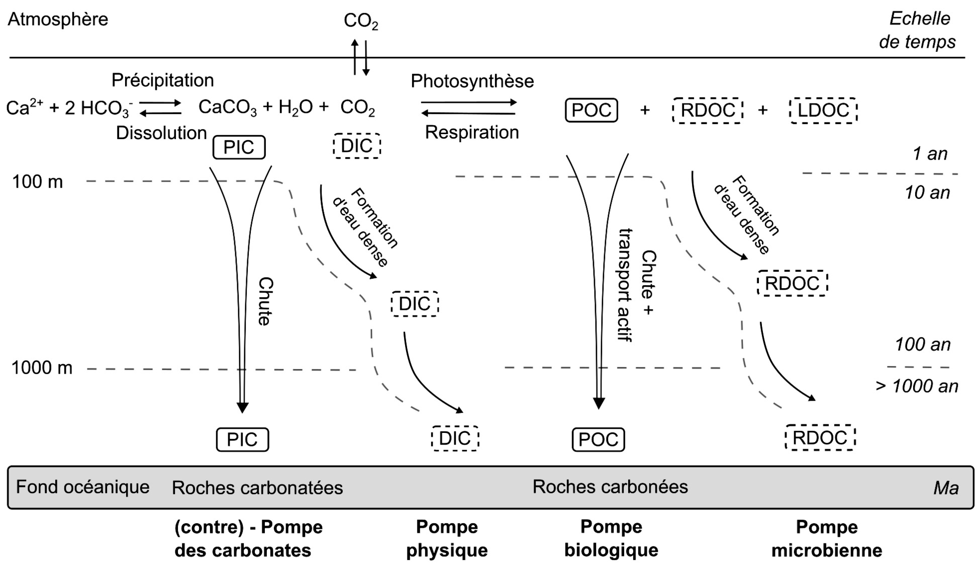 Les échelles de temps représentent l'ordre de grandeur du temps de résidence du carbone dans les différentes couches océaniques avant qu'il ne rejoigne l'atmosphère.