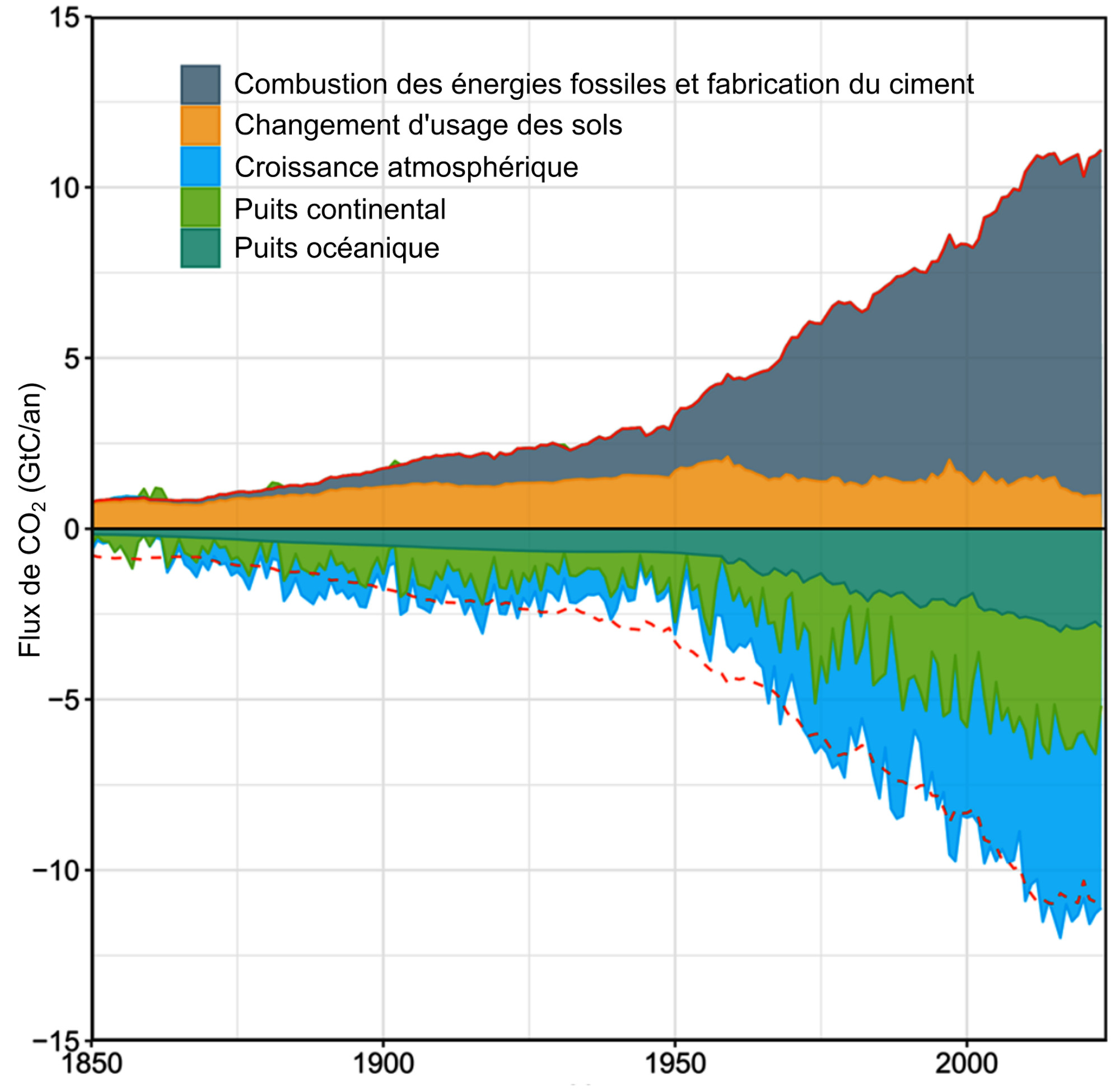 Les émissions anthropiques annuelles sont représentées par un flux positif. Les puits sont représentés par un flux négatif. Toutes les estimations sont indépendantes et issues de modèles alimentés par des données de terrain. La courbe rouge pointillée, symétrique de la somme des sources, représente le puits total théorique attendu pour compenser les sources.