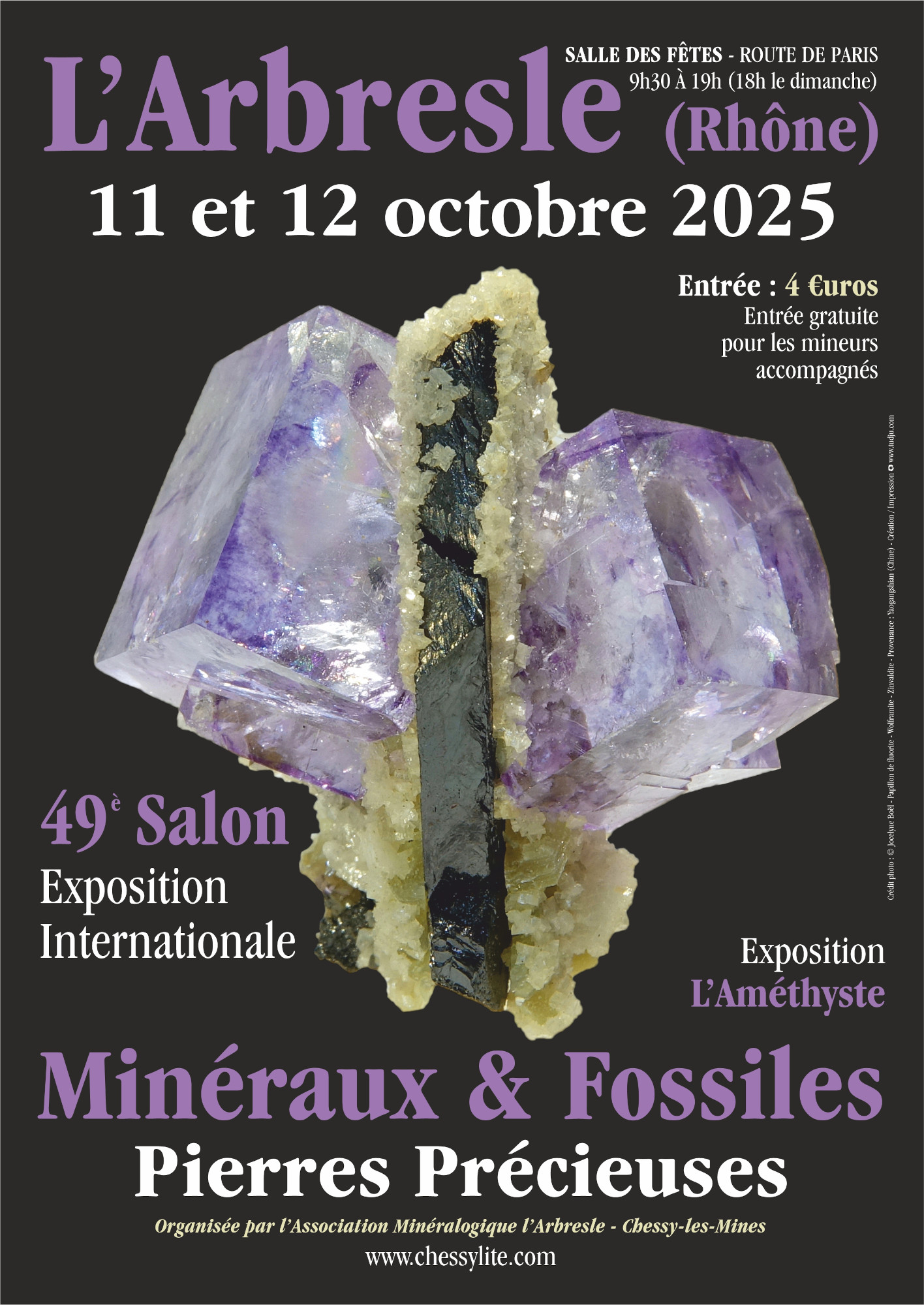 Ce 49e salon de L’Arbresle réunit plus de 40 exposants (roches, minéraux cristallisés, fossiles). Une exposition thématique sur l’améthyste présentera des échantillons locaux, de France et de l’étranger.